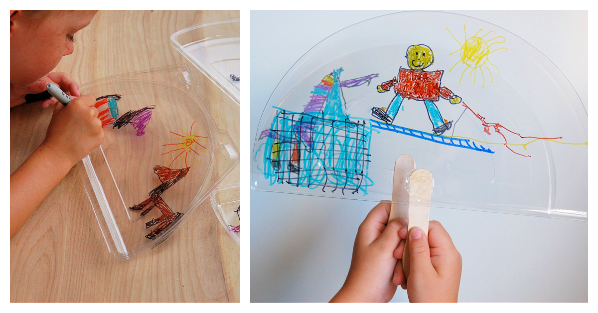 1. Use the permanent markers to draw pictures on the plastic lids or plates.