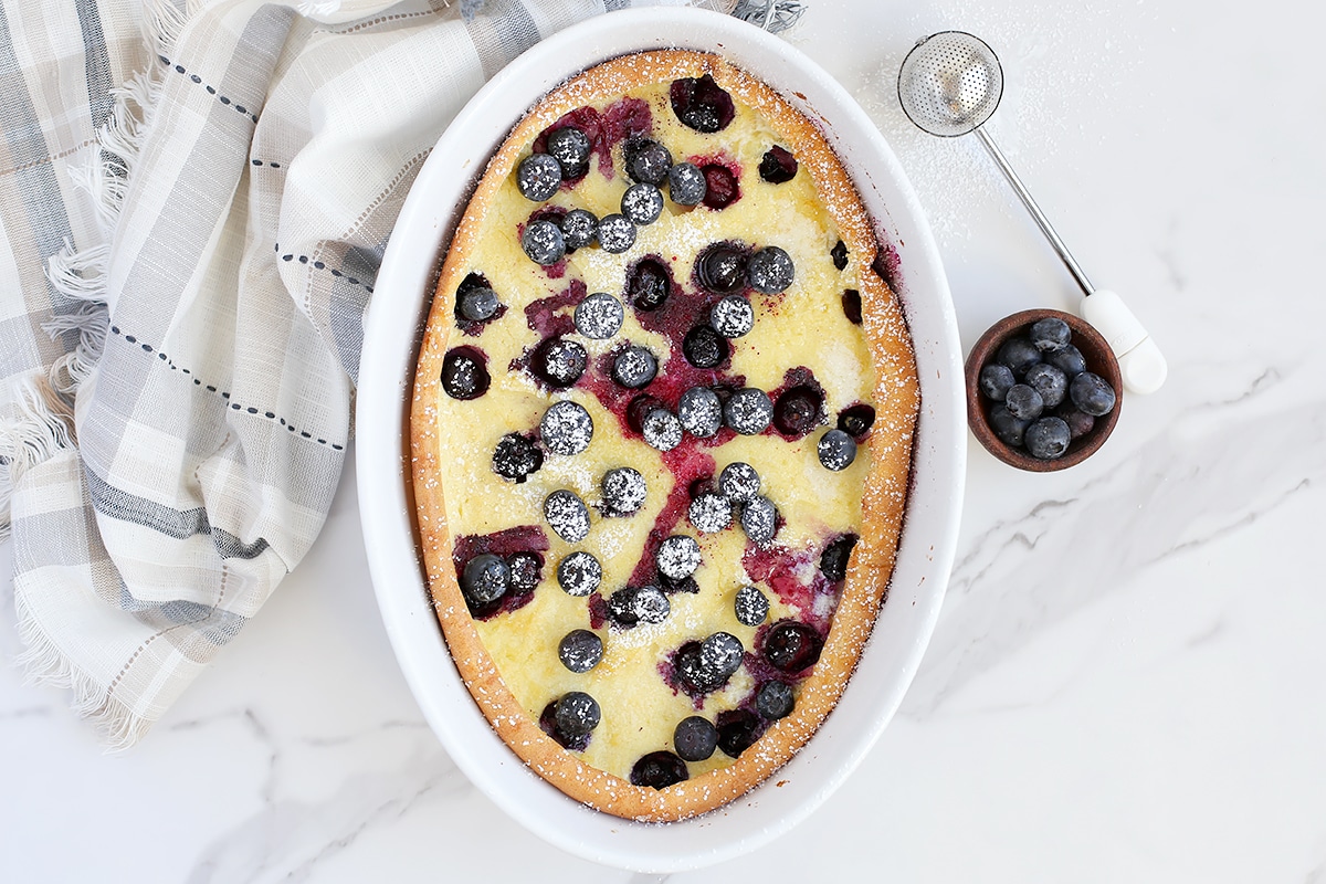 Fresh blueberries add a delicious pop of flavor and color to our favorite dutch baby pancake recipe. It’s a delicious breakfast recipe that is perfect for special occasions but easy enough for a weekday!