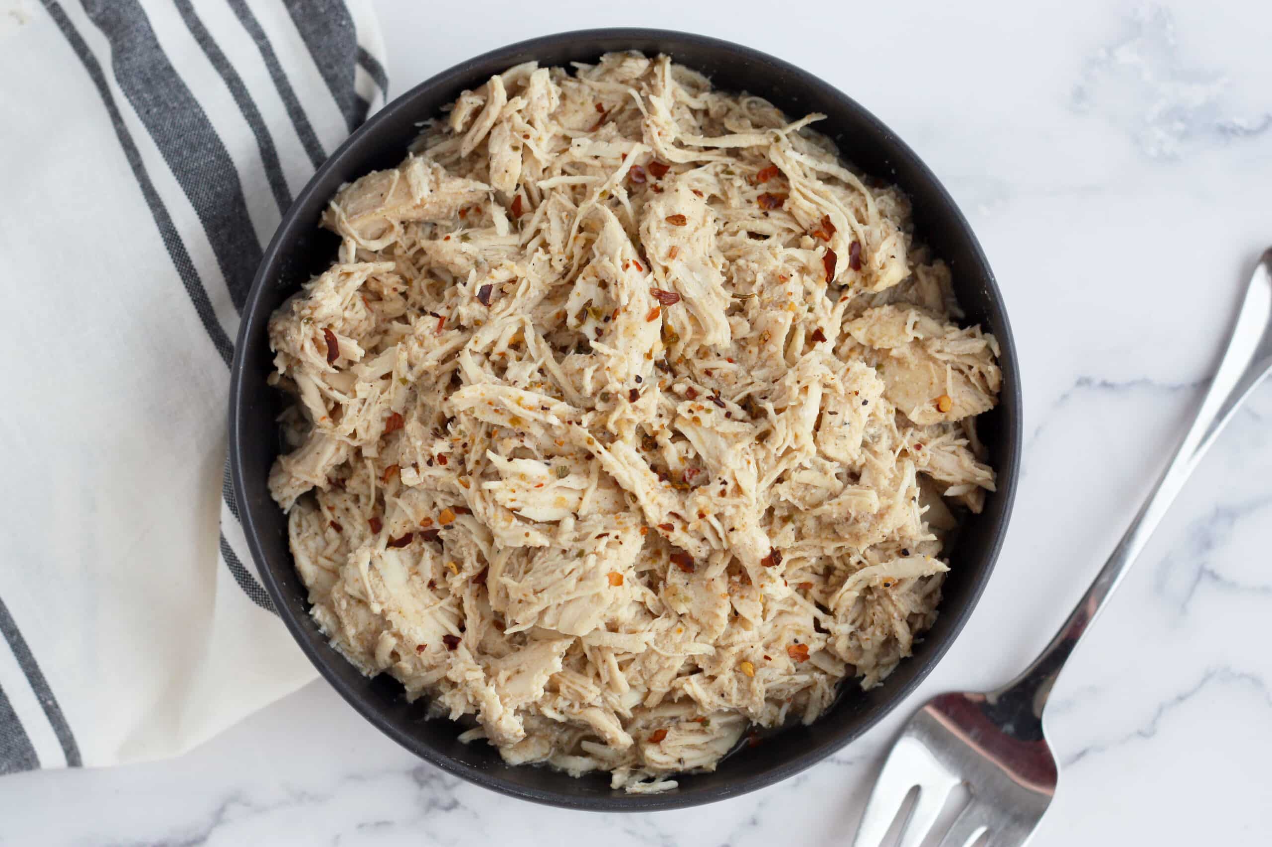 An easy hack for shredding chicken is to cool the chicken slightly after it is cooked. Put the chicken into a large bowl or the bowl of a stand mixer. Use a hand mixer or stand mixer fitted with the paddle attachment to shred the chicken. Start on low speed and gradually increase to medium-high speed. The chicken will shred quickly and evenly within a minute or two!