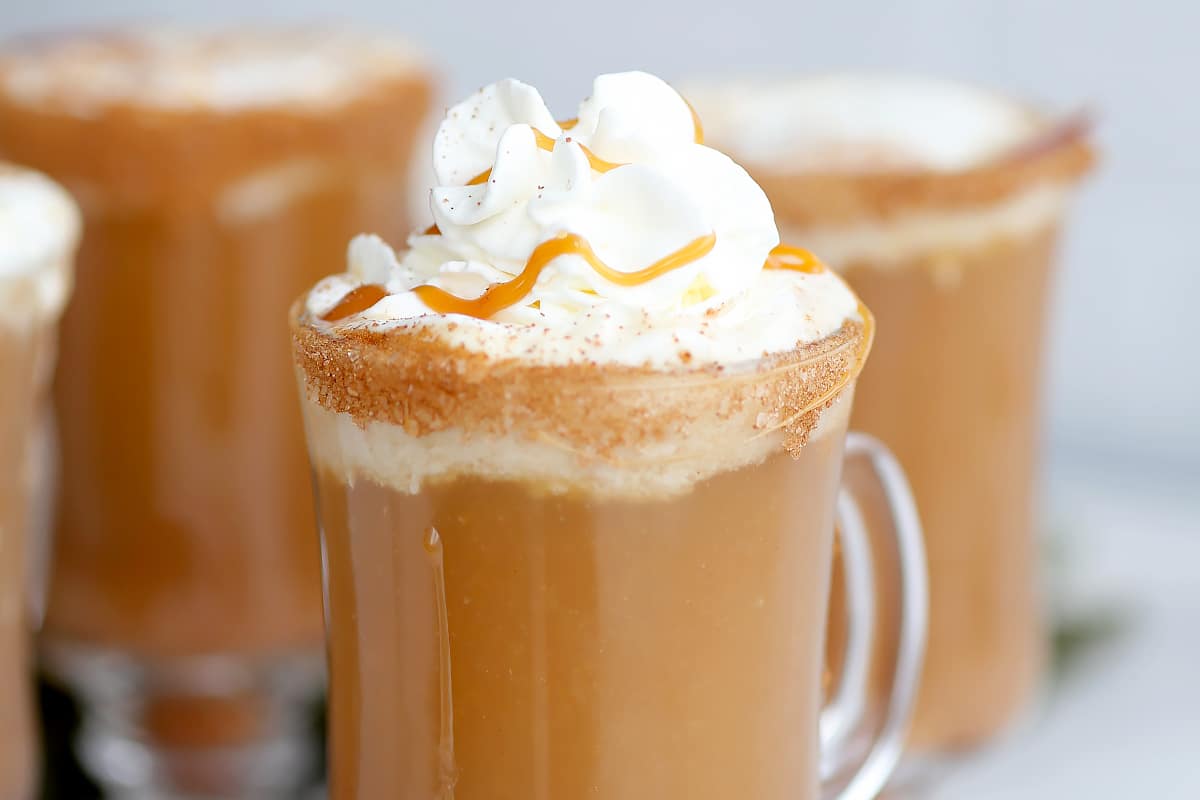 We coated the rims of our mugs in cinnamon sugar to add an extra little something. Completely unnecessary, but that’s the fun of it! To do this, add some apple juice (or water) to a shallow bowl. To another shallow bowl, add about 1/4 cup of granulated sugar and 1/2 teaspoon ground cinnamon. We also added a bit of turbinado sugar for a bit of sparkle. Stir to combine. Take the rim of your mug and dip it into the apple juice. Allow the excess to drip off, then roll it in the cinnamon sugar.