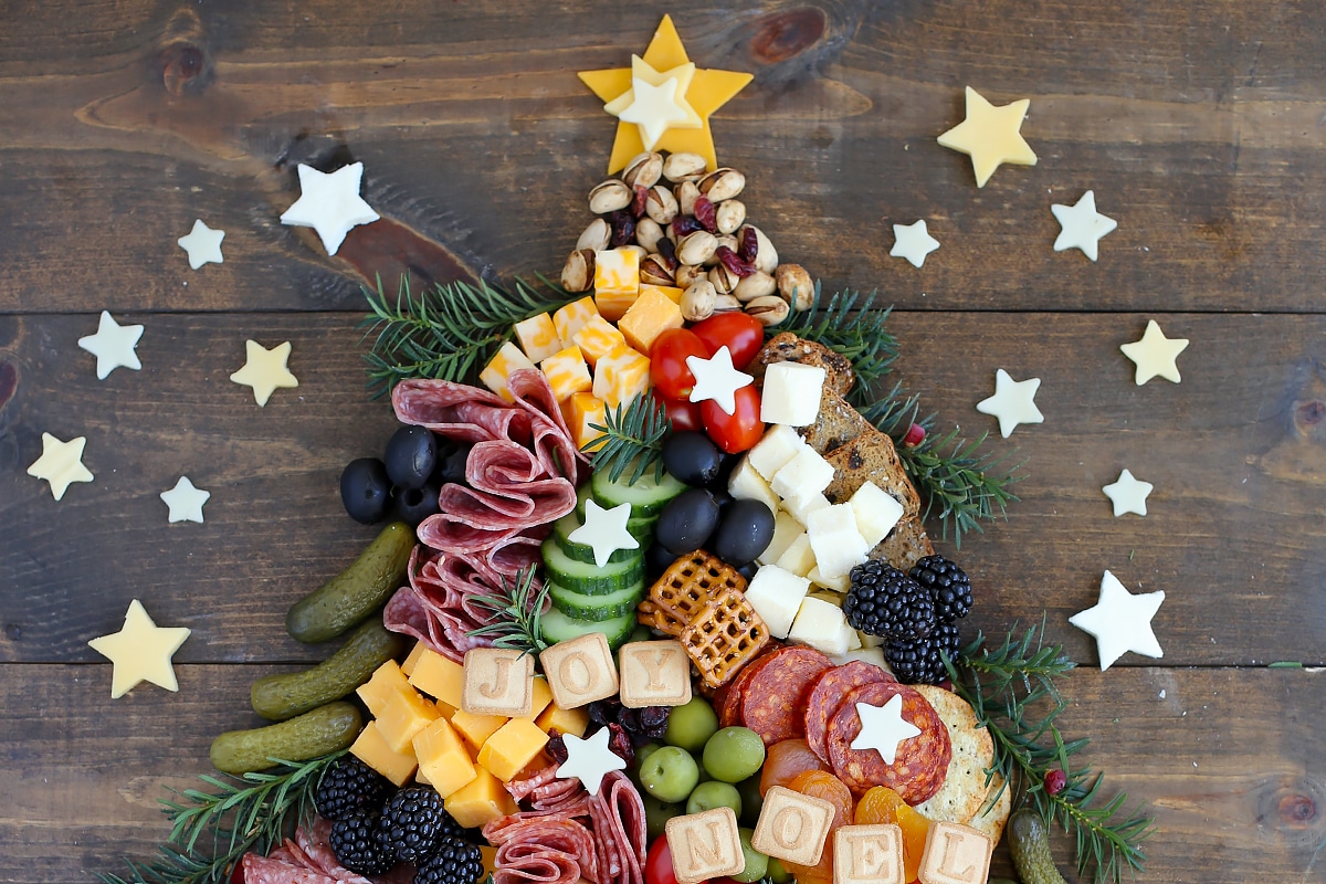 Fill any empty spaces or gaps with smaller ingredients. Using a small star cookie cutter, make cheese shapes and place around the charcuterie tree with a larger cheese star at the top of the tree. Finish with adding fresh herbs around the tree to make it more festive (rosemary sprigs are great for this board). Serve and enjoy!