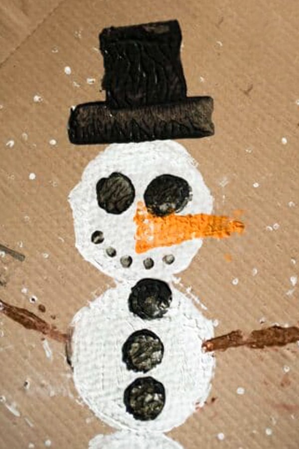 Upcycle a box into a snowman painting project for kids! Stamp down snowballs!