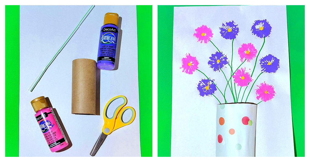 This flower craft will allow kids to practice fine motor skills and explore colors. It’s fairly simple, but smaller kids like toddlers and preschoolers may need a little help making their straw stamps. But after that it is pretty easy!