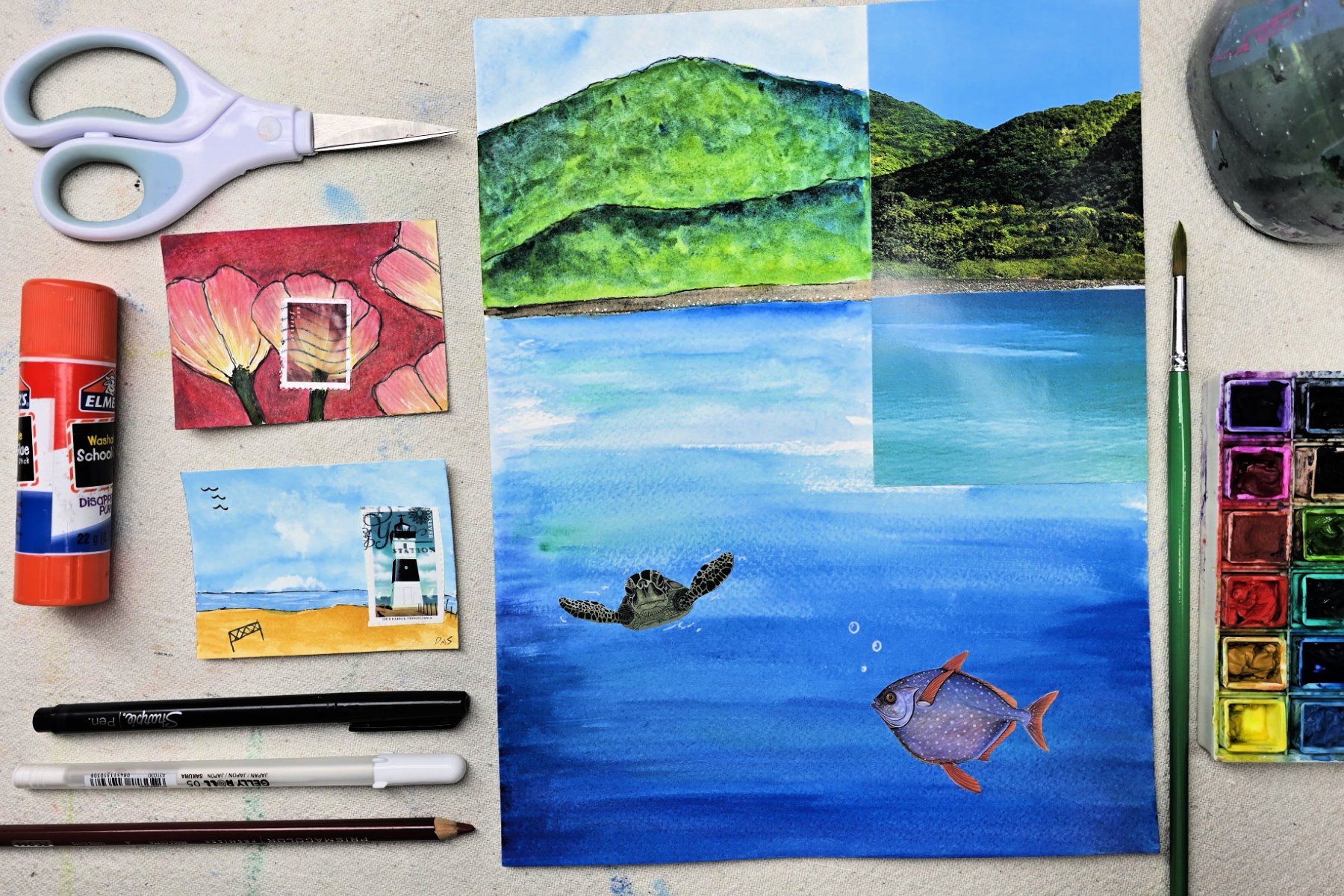 Art is all around us and available for us to repurpose in our own unique ways. For this project, we can reuse stamps, magazine clippings, portions of junk mail, and so on. This activity pushes kids to think outside the box by taking art they can see and hold in their hands to then create a larger picture from their imagination.
