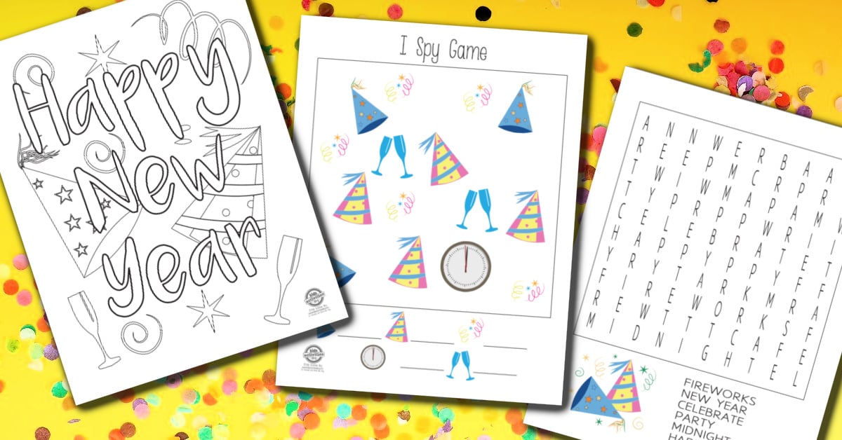 Ring in 2025 with this pack of 3 free happy New Year printable worksheets for kids which include a NYE I Spy Game, Happy New Year coloring page that can double as a banner and a New Year Word Search.
