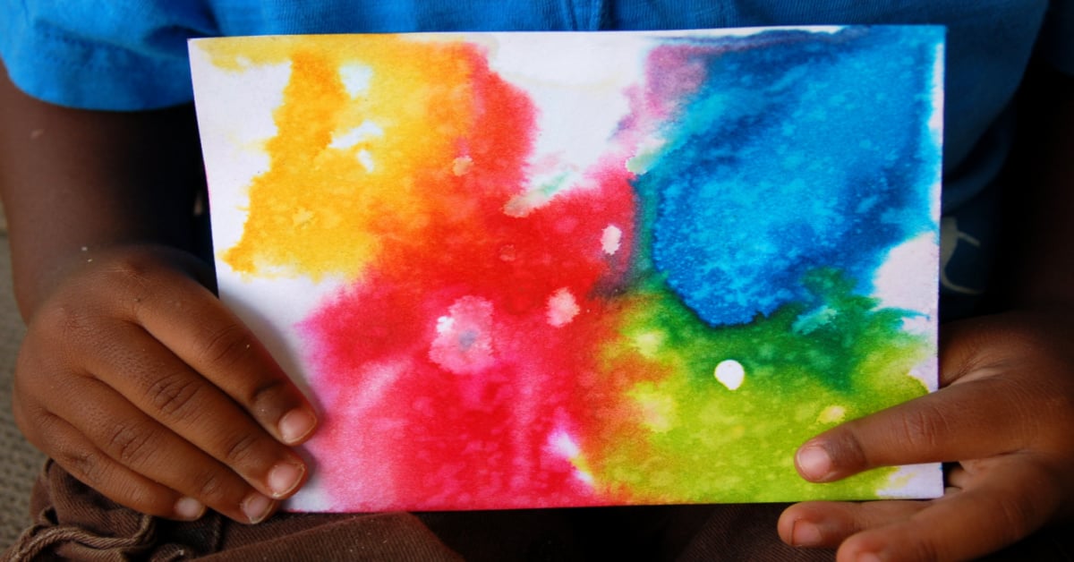 Older kids can further their art by adding embellishments. You can cut them shorter and turn them into postcards to send to friends and family. Or you could do something like draw around the color explosions and turn them into something unique.