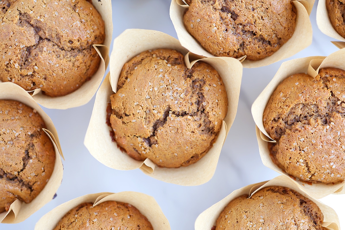 This little gem is no exception. It’s a simple, no frills muffin. Stir up the ingredients, plop them in a pan and bake. But they’re almost addicting in their simplicity. Tender muffins, packed with gingerbread spices, and topped with coarse sugar for a little bit of crunch. They’re delicious served warm slathered with butter. But I think the flavor is even better the second day. They freeze beautifully, and a basket of these muffins makes a great gift during the holidays.