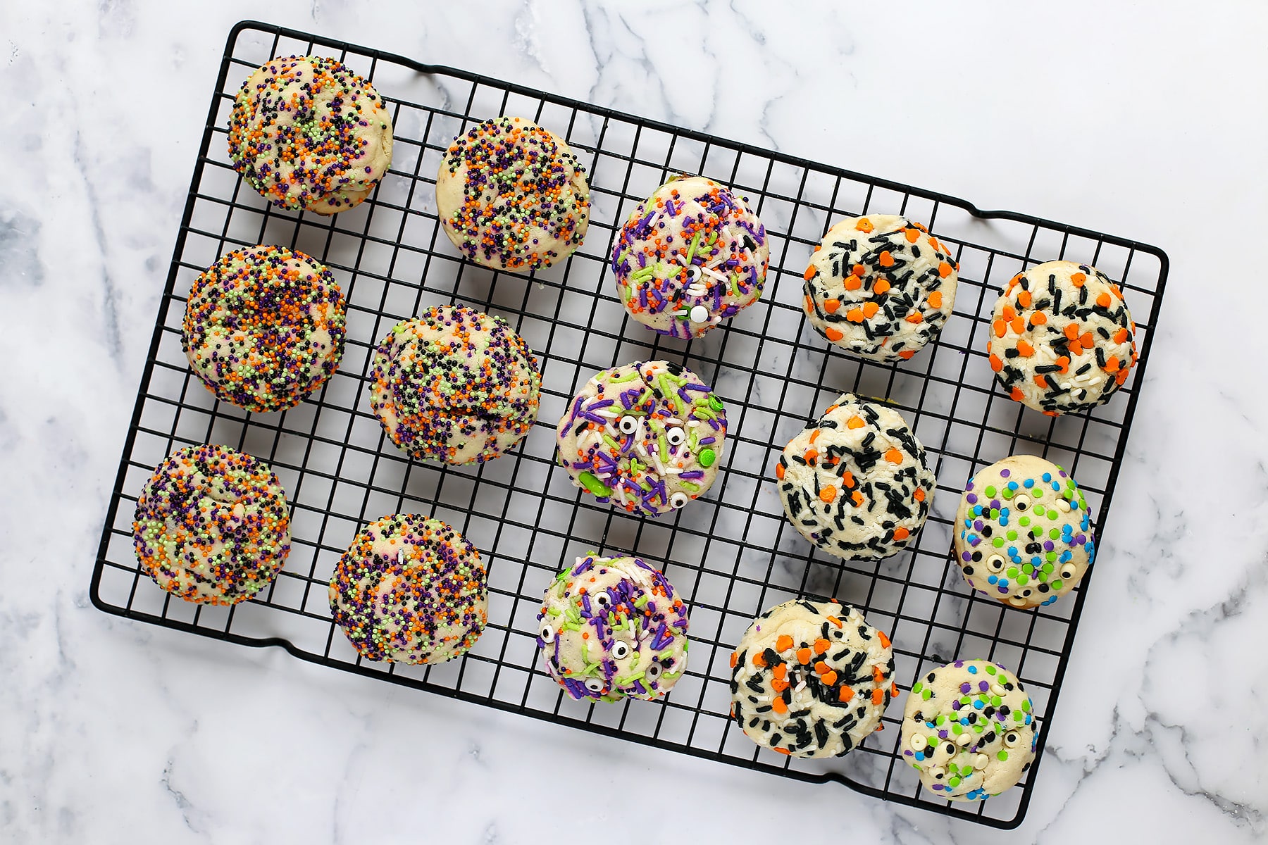 • Scoop the dough, about 2 tablespoons at a time and roll the top and sides into your halloween sprinkles. Try not to get a lot of sprinkles on the bottom of the dough ball that will touch the pan because they can melt and burn.