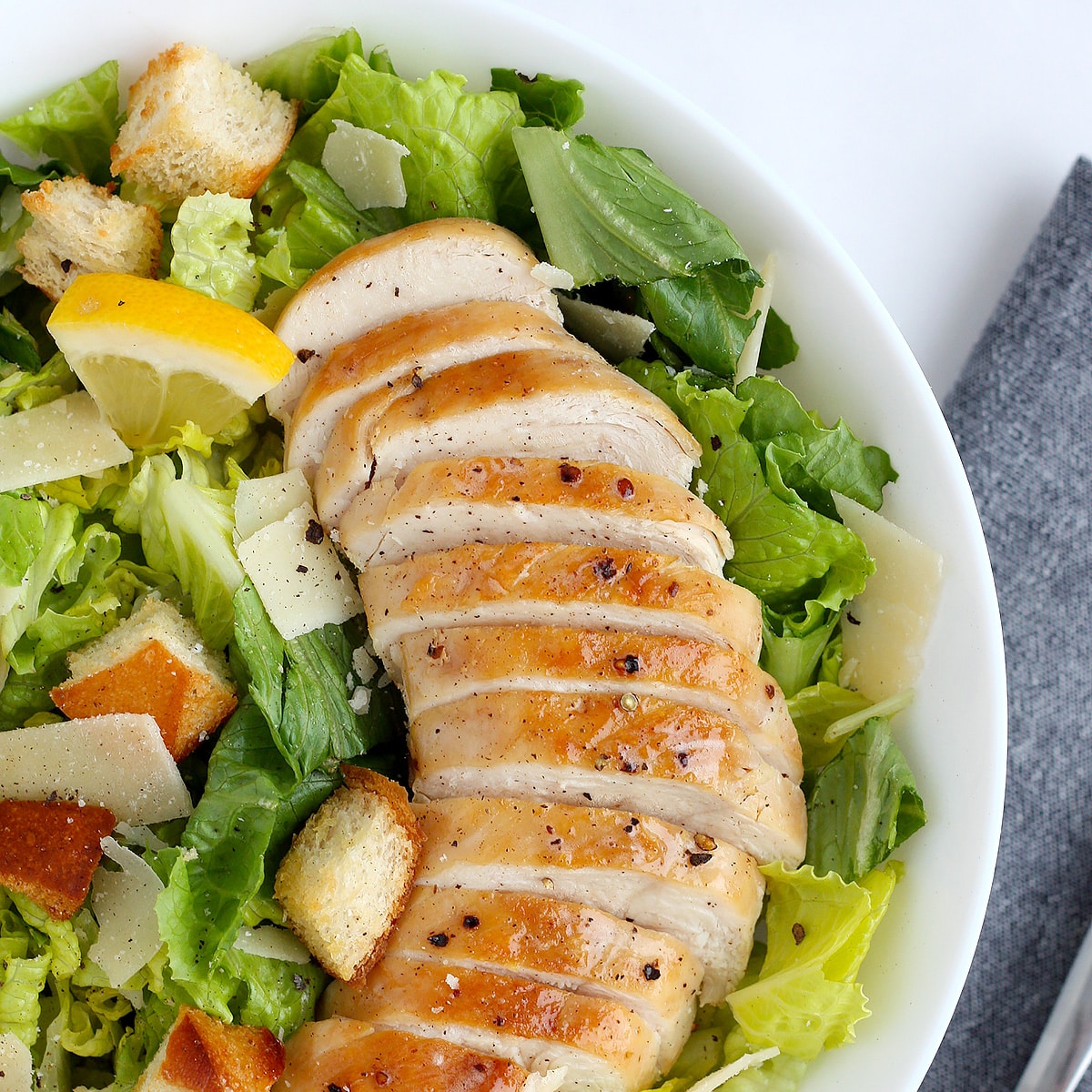 To Assemble: Add chopped romaine lettuce to a large serving bowl. Layer the sliced chicken cooled croutons on top, and then sprinkle with shave parmesan. Serve the dressing on the side, or drizzle the salad with dressing and toss to combine just before serving. Enjoy!