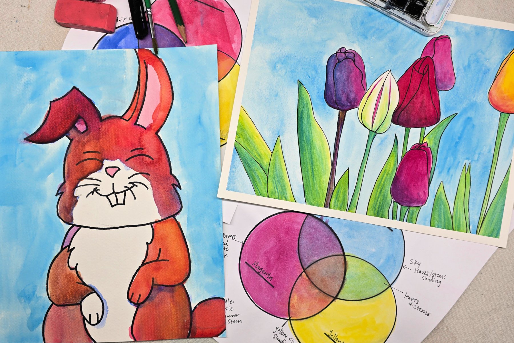completed layering watercolors worksheets and spring paintings of a rabbit and flowers - kids activities blog