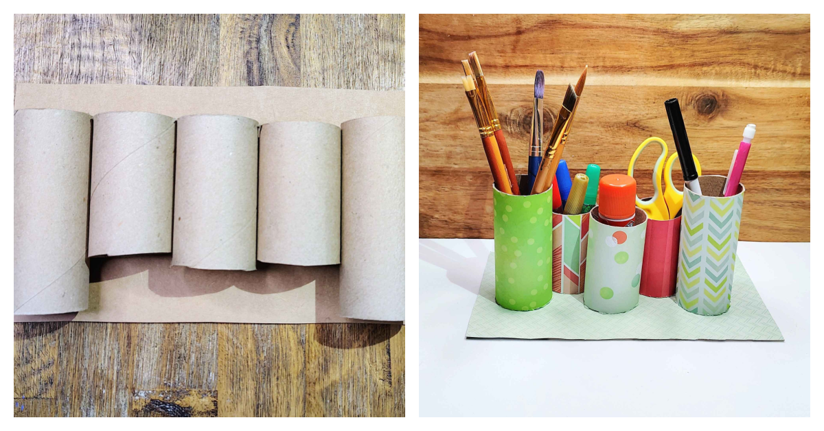 - Using your hot glue gun, glue around the bottoms of each toilet paper tube. Press it down on the decorated cardboard. Once dry fill your art supply storage with your loose art supplies.