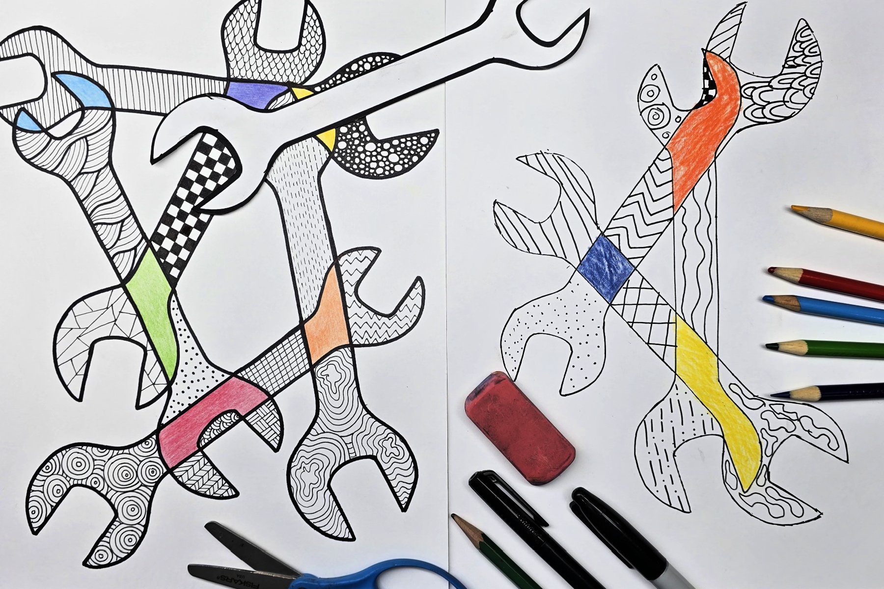 - Complete the project by using a fine tip permanent marker to add zentangle patterns to the remaining sections of the wrench shapes.