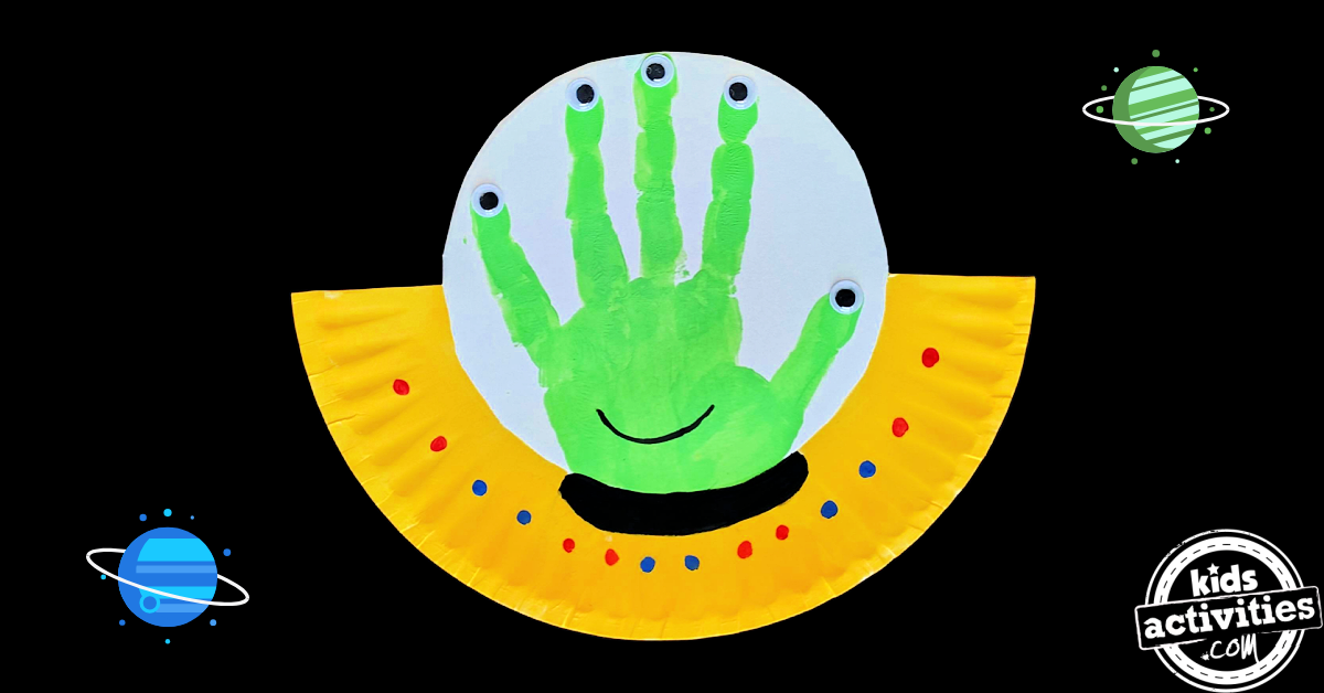 Today we are making an alien craft! Kids of all ages will have so much fun making this super silly alien craft. It uses basic crafting supplies and is so much fun to make! This simple paper plate craft allows you to make a handprint alien and a flying saucer! This UFO craft is out of this world! You can make this alien craft at home or in the classroom.