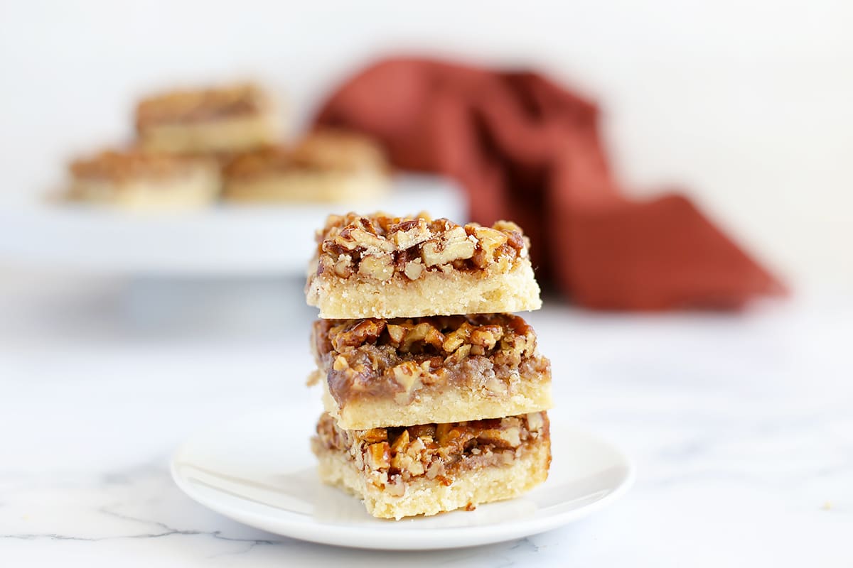 These Pecan Pie Bars have a buttery shortbread crust and a caramel-y pecan filling. They are a deliciously decadent treat that are perfect for the holidays and a favorite with everyone who tries them!