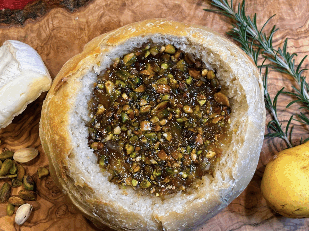• Add the toppings: Spread the pear preserves evenly over the cheese, then sprinkle with the chopped pistachios. Cut the bread top down to about 1 inch, then place back on the loaf.