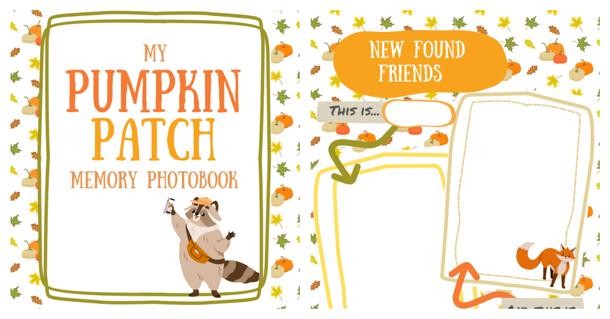 Pumpkin Patch Memory Book- Cover with fall decor like leaves and pumpkins in fall colors: orange, yellow, and green with text, a green border, and raccoon colored printed pdf file -Kids Activities Blog