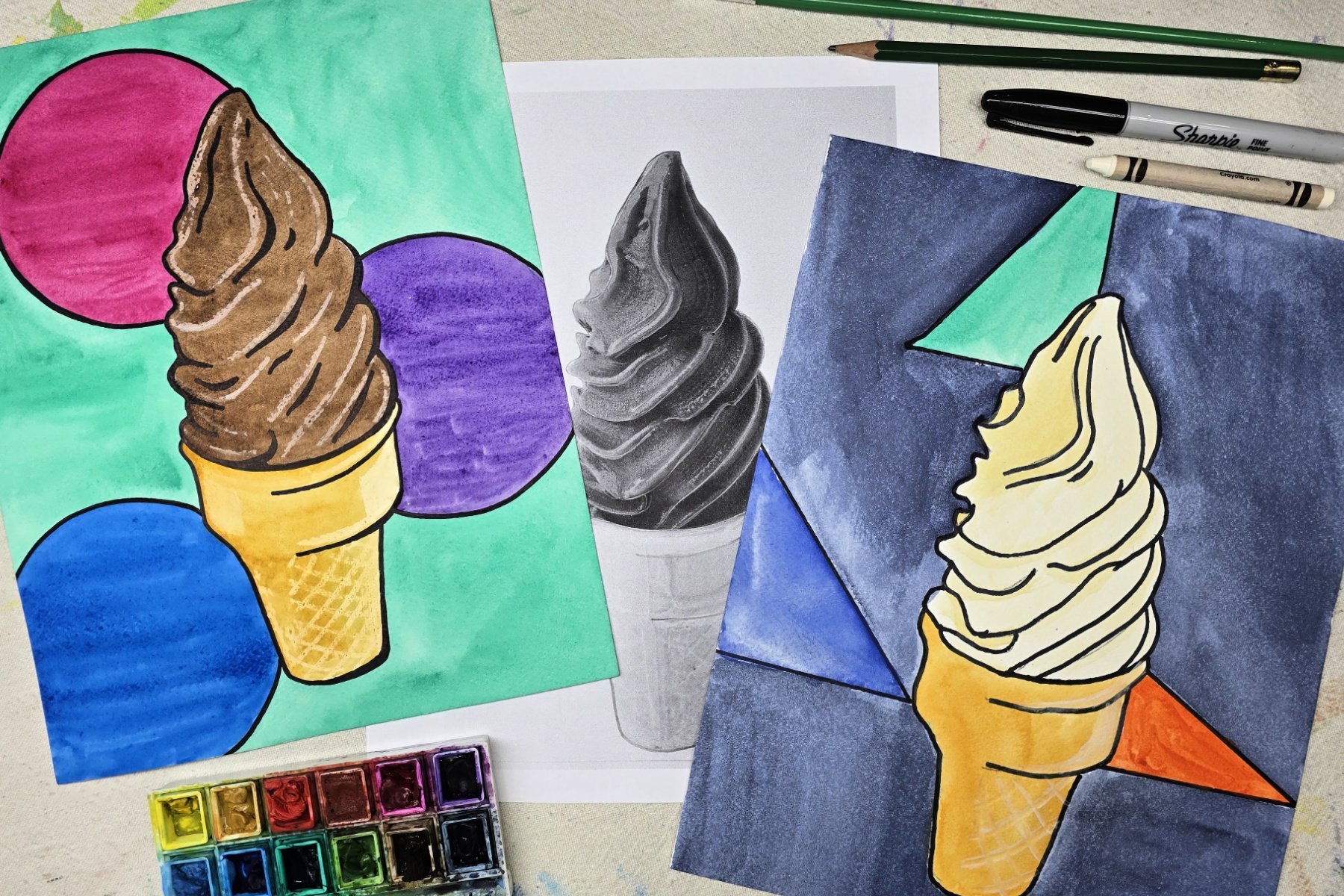 School-aged kids will use a wax resist technique to create an ice cream cone painting in this fun project. We’ve included a free printable to make this lesson easy for home or classroom use.