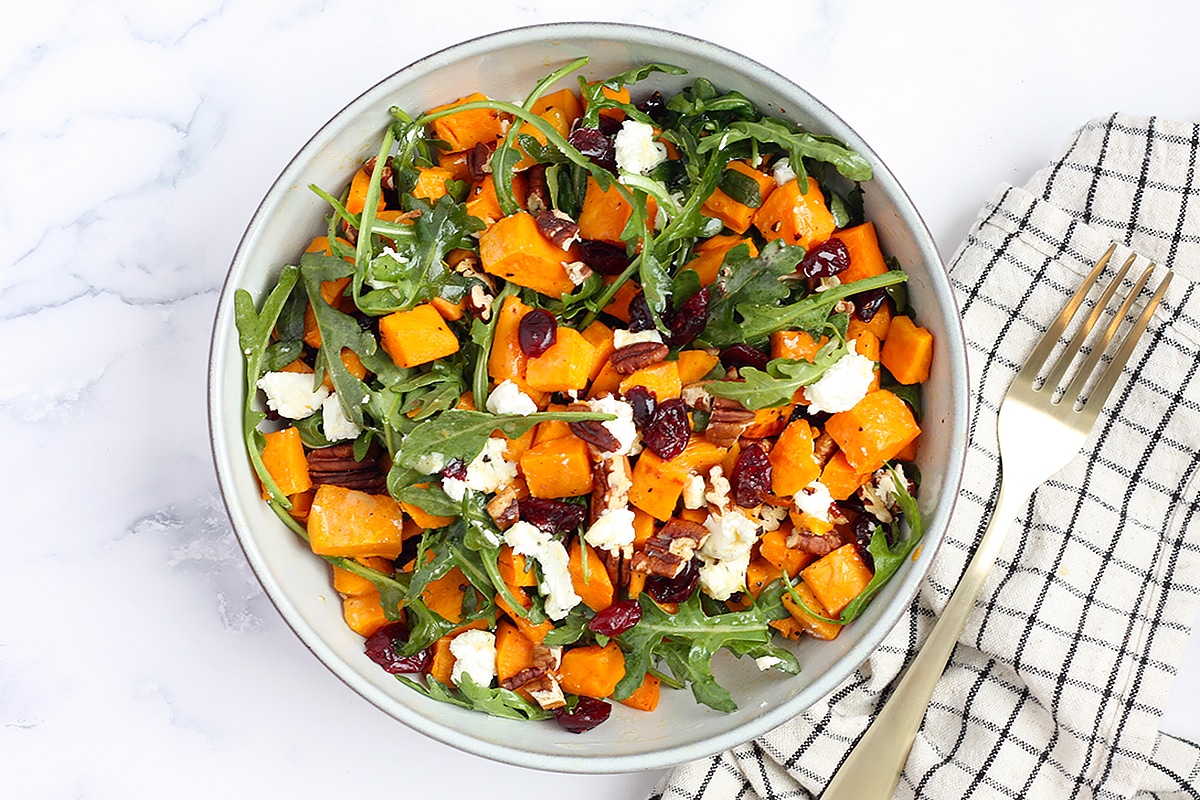 - Assemble the salad. In a large serving bowl, add the arugula, toasted pecans, dried cranberries, sweet potatoes, and goat cheese. Drizzle with the dressing and toss to combine. Dig in!