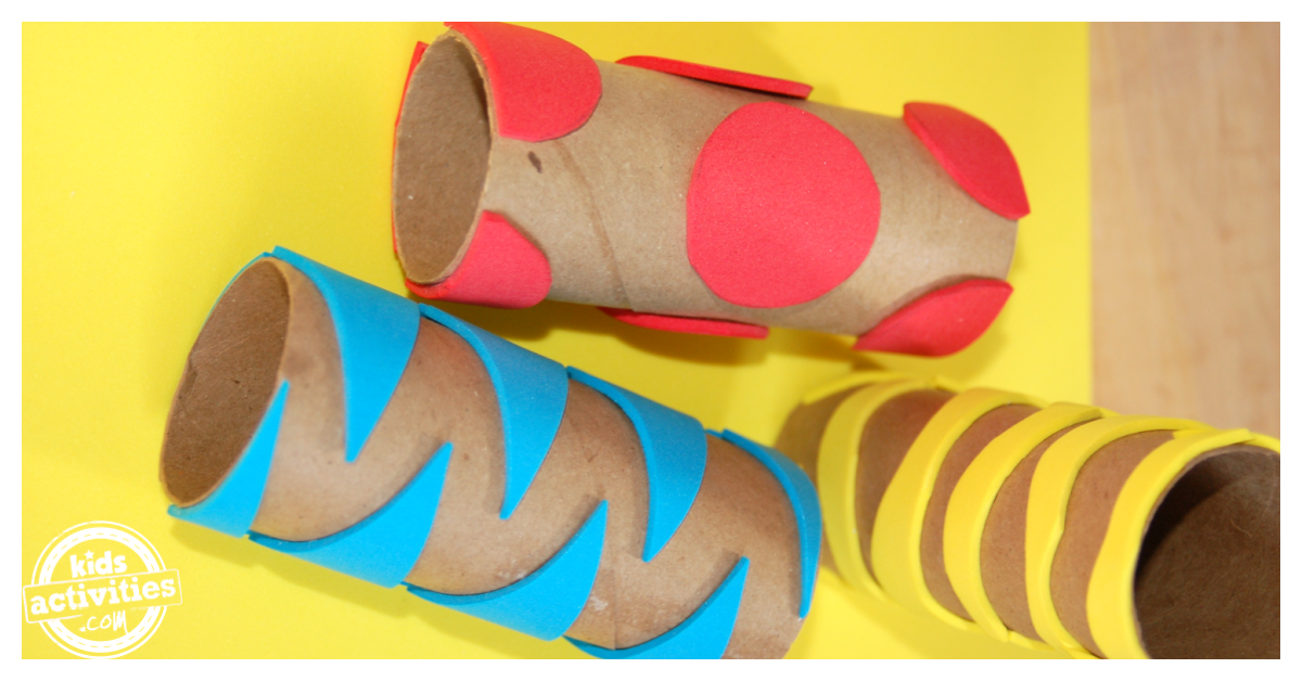 If your little one is a bit too young for scissors, then you can use foam stickers. It’ll be a bit easier. You can also put a small dowel rod through the toilet paper roll so they can roll it a little easier.