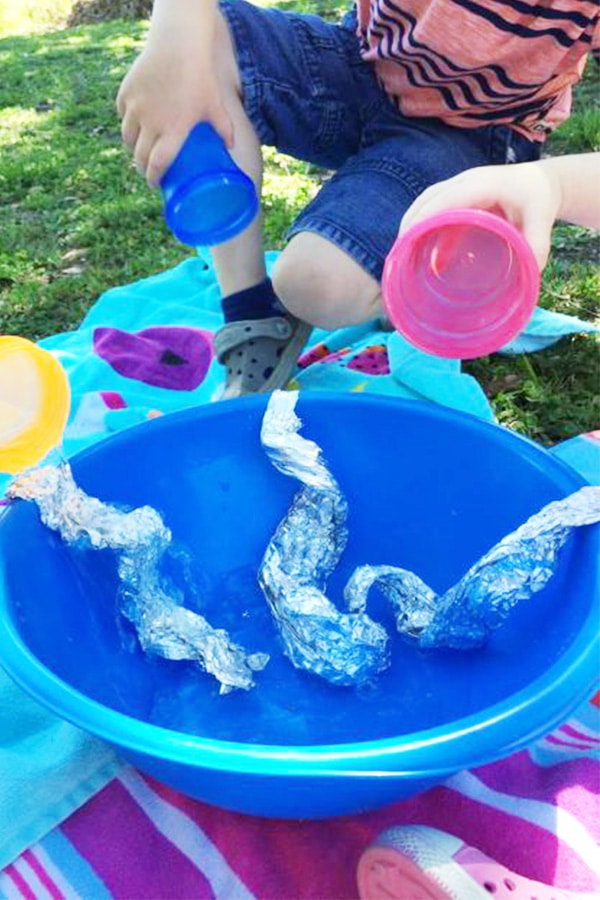 We loved the interesting sound that the water made when we poured it over the tin foil! This water play idea offers tons of fun sensory input.