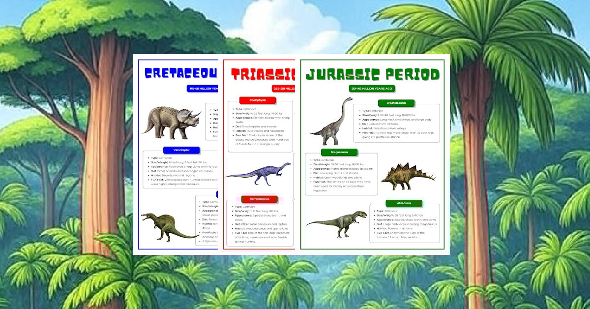 Our first dinosaur printables are about the different periods when dinosaurs roamed. Learn about which dinosaurs roamed when and about fun facts about each one.